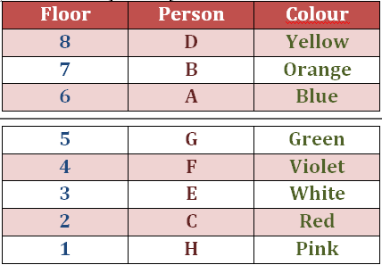 Eight persons A, B, C, D, E, F, G and H live in an eight-storey building. Each of them likes a different coloursviz Red, Green, Yellow, Pink, White, Orange, Violet and Blue, but not necessarily in the same order. The lowermost floor is numbered 1 and the topmost floor is numbered 8. There is only one floor between the one who likes Yellow and the one who likes Blue. There are two floors between the one who likes Green and C. F lives on an even-numbered floor and likes Violet. Neither A nor B likes Green or White. The one who likes Pink lives on floor numbered 1. There are three floors between the floor on which B lives and the floor onwhich E lives. F lives above C, who does not live on first floor but likes Red. Only one person lives between the one who likes White and the one who likes Green. The one who likes Yellow lives on the topmost floor. H does not like Yellow, G lives on the floor number which is between A and F. B lives above E.