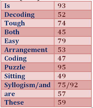 In a certain code language, 'coding decoding is easy' is coded as '79 93 47 52', 'sitting arrangement is tough' is coded as '49 53 74 93', 'syllogism and puzzle both are tough' is coded as '57 75 74 95 45 92', 'both arrangement are easy' is coded as '45 79 57 53' and 'these are coding puzzle' is coded as '57 47 59 95'.