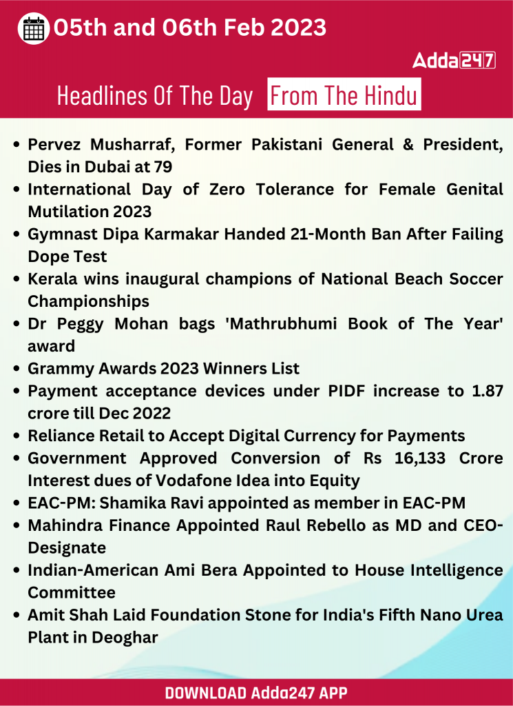 Here is the Current Affairs 05th and 06th February 2023 covering the following news headlines: Lata Mangeshkar, Pervez Musharraf, Dipa Karmakar, National Beach Soccer Championships, Grammy Awards 2023, EAC-PM, House Intelligence Committee.