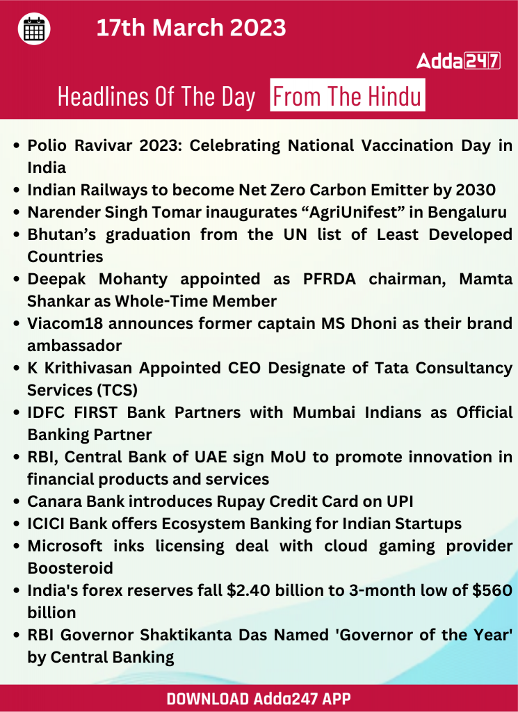 Here is the Current Affairs 17th March 2023 covering the following news headlines: “AgriUnifest” in Bengaluru, Indian Railways, Bhutan’s graduation, India’s GDP growth, RBI, Central Bank of UAE.