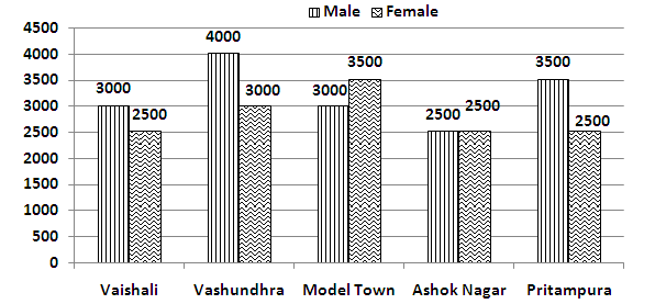 Q3. What is the difference between the total number of females and the total number of males from organization Vaishali, Vashundra, Model Town and Ashok Nagar together?