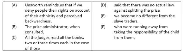 Directions (11-15): In the following questions two columns are given containing three sentences/phrases each. In first column, sentences/phrases are A, B and C and in the second column the sentences/phrases are D, E and F. A sentence/phrase from the first column may or may not connect with another sentence/phrase from the second column to make a grammatically and contextually correct sentence. Each question has five options, four of which display the sequence(s) in which the sentences/phrases can be joined to form a grammatically and contextually correct sentence. If none of the options given forms a correct sentence after combination or none of them connects, mark (e), i.e. “None of the above” as your answer.