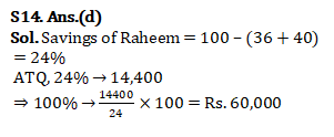 Q14. Raheem spends 36% of his monthly income on daily spendings, 40% on house rent and children fee together and rest amount he saves for future needs. If his total savings be Rs. 14,400. Find his total monthly income.
