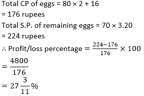 Q8. A man bought 80 eggs at the rate of 24 rupees per dozen 10 eggs got broken and the remaining eggs he sold at 3.20 rupees per egg. If he had spent 16 rupees on other expenses, find his profit or loss percentage.