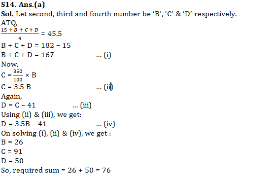 Q14. Average of four numbers is 45.5. Third number is 250% more than the second number and fourth number is 41 less than third number. If first number is 15, then find the sum of second and fourth number.