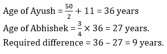 Q7. The age of Abhishek is 3/4th of the age of Ayush. The age of Ayush is 11 years more than the average age of his two sons whose total age is 50 years. Then find the difference of age of Abhishek and Ayush ?