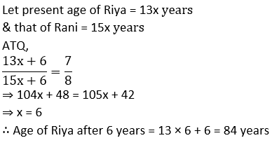 Q11. The present ages of Riya and Rani are in the ratio of 13 : 15 respectively. After 6 years, the respective ratio between the age of Riya and Rani will be 7 : 8. What will be the age of Riya after 6 years ?