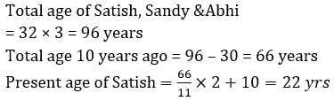 Q6. The average age of Satish, Sandy &Abhi is 32 years and the ratio of their ages 10 years ago was 2 : 4 : 5 respectively . Find the present age of Satish?