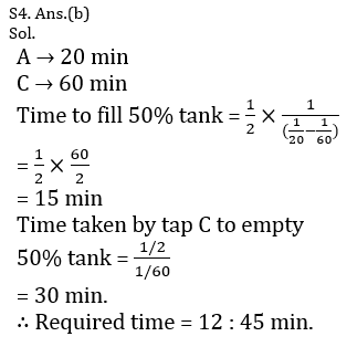 Q4. Tap A fills a tank in 20 minutes while C empties it at 1/3rd the rate at which A fills it. At 12 : 00 noon, A and C are simultaneously started and when the tank is 50% full, tap A is turned off. At what time will the tank be empty?