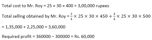 Q3. Mr. Roy bought a plot @ 400 rupees per sq. feet. After sometimes, he sold 40% of the plot @ 450 rupees per sq. feet and rest @ 500 rupees sq. feet. If dimensions of plot are 25 feet × 30 feet, then find his total profit in this transaction.