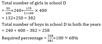 Q3. In school D, there are 55% girls in year 2014 and 62 ½% girls in year 2016. Number of boys in school D in both the year is approximately what percent of the total number of girls in same school in both the year.