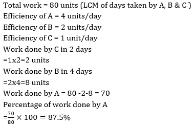 Q8. A, B & C can do a piece of work in 20 days, 40 days & 80 days respectively. All three start work simultaneously and after two days C left the work, after another two days B also left the work. Find the percentage of work done by A, If A working alone and complete the remaining work?