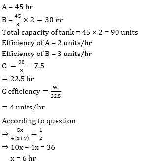 Q9. Pipe A can fill a tank in 45 hr, pipe B is 50% more efficient than A and pipe C can fill the same tank in 7.5 hr less than B. A and B opened together after X hr both pipe closed and pipe C filled remaining tank in (X + 9) hr, if the ratio between tank filled by (A + B) together to tank filled by pipe C is 1 : 2. Find the value of X ?