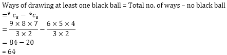 Q10. A box contains 2 white balls, 3 black balls and 4 red balls. In how many ways can 3 balls be drawn from the box, if at least one black ball is to be included in the draw?