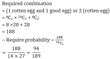 Q7. In a container there are 28 eggs out of which 8 eggs are rotten. If two eggs are chosen at random, what will be the probability that atleast one egg is rotten?
