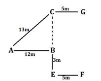 Point B is south of point C which is 5m west of point G. Point E is 3m south of point B. Point C is 13m north-east of point A. Point F 5m east of point E. Point A is 12m west of point B.