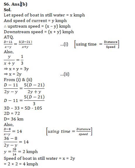 Q6. Time taken by a boat to cover (D-11) km in upstream is 5 times of the time taken by boat to cover (D-21) km in downstream. If ratio of speed of current to speed of boat in downstream is 1 : 3 and boat can cover (D-8) km in upstream in 14 hours, then, find speed of boat in still water?