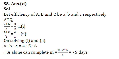 Q8. A, B and C can complete a work in 20 days working together. A and B together are 50% more efficient than C and A & C together are 100% more efficient than B. Then in how many days A alone can complete the work?