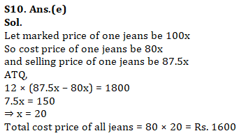 Q10. Veer bought 12 jeans at a discount of 12.5%. If cost price of one jeans is 80% of marked price of one jeans and total profit obtained on all jeans is Rs.1800 then find the total cost price of one jeans.