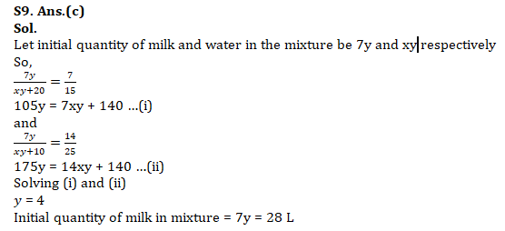 Q9. A container contains mixture of milk and water in the ratio 7 : x. If 20 litre of water is added to mixture then ratio of milk to water becomes 7 : 15 and if 10 litres of water is added then ratio of milk to water becomes 14 : 25. Find initial quantity of milk in the mixture.