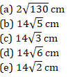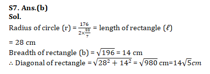 Q7. Length of rectangle is equal to the radius of a circle whose circumference is 176 cm and breadth of rectangle is equal to the side of square whose area is 196 cm², then find the length of a diagonal of that rectangle?
