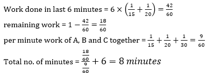 Q9. Three pipes A, B and C can fill a tank in 15 minutes, 20 minutes and 30 minutes respectively. All three pipes started to fill the tank at same time. The pipe C is closed 6 minutes before the tank is filled. In what time the tank will be full?