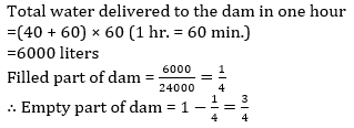 Q4. Two taps X and Y can deliver water to a dam at the rate of 40 lit/min and 60 lit/min. respectively. If capacity of dam is 24000 li then what part of dam will remain empty after one hour of starting of both taps?