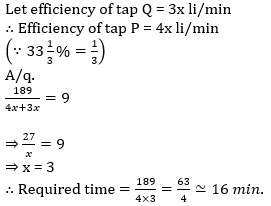 Q3. Efficiency of a filling tap P is 33⅓% more than that of another filling tap Q. If both are opened simultaneously, a tank of capacity 189 li. can be filled in 9min. Then in what time tap P can fill the tank alone? (approximately)