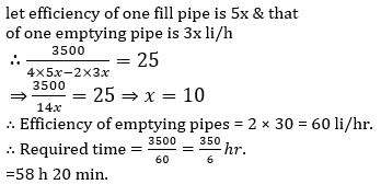 Q1. There are four filling pipes and two emptying pipes. The ratio of efficiency of filling pipe to emptying pipe is 5 : 3. All the pipes, (filling & emptying) are opened simultaneously, and a tank of capacity 3500 liters is filled in 25 hrs. In what time emptying pipes can empty the filled tank ?
