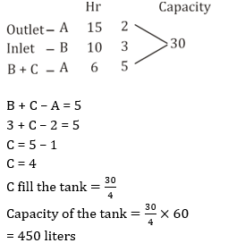 Q10. Outlet Pipe A can empty a tank in 15 hr and another inlet pipe B can fill the same tank in 10 hr and third inlet pipe C can fill the water at the rate of 60 ltr/ hr. All the pipe opened together then the tank fill in 6 hr. Find the capacity of tank ?