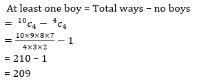 Q6. In a group of 6 boys and 4 girls, four children are to be selected. In how many different ways can they be selected such that at least one boy should be there?