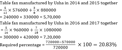 Q1. Table fan manufactured by Usha company in 2014 and 2015 together is what percent less than that of table fan manufactured by same company in 2016 and 2017 together?