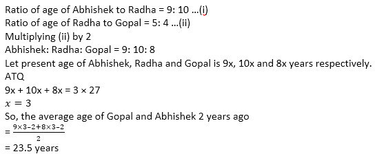 Q5. The ratio of present ages of Abhishek and Radha is 9 : 10 and ratio of present ages of Radha and Gopal is 5 : 4. If the average age of Abhishek, Radha and Gopal is 27 years. Then find the average age of Gopal and Abhishek 2 years ago.