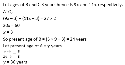Q10. Ratio of ages of A to B, 4 year before from now was 8 : 5 and ratio of ages of B to C 3 years hence will be 9 : 11. If the present average age of B and C is 27 years then find the present age of A.