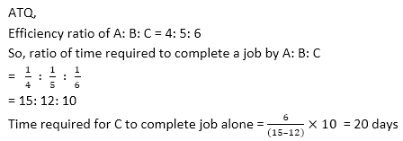 Q7. A is 20% less efficient than B and C is 50% more efficient than A. If B alone can complete a job in 6 days less time than A then C alone can complete the same job in how much time.