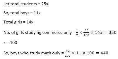 Q1. There are certain number of students in a college in which the ratio of boy and girl is 11: 14. 40% boys study math only, 30% boys study Bio only and rest boys study commerce only. Half of the girls study Bio only while half of the rest girls study math only. If total no. of girls who study commerce is 350, then find the total no. of boys who study math only. (There are only three disciplines in the college)
