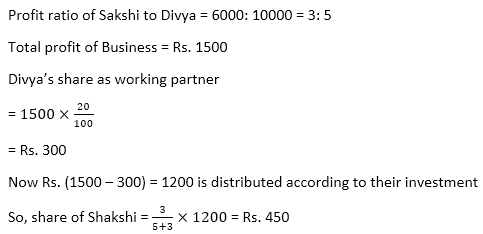 Q10. Sakshi and Divya started a business with investment Rs. 6000 and Rs. 10000 respectively. Divya also worked as working partner for that she charged 20% of total profit and remaining profit was divided between them in the ratio of their investment. After 1year total profit from business was Rs. 1500. Find the profit share of Sakshi.
