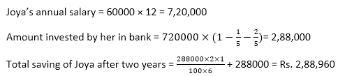 Q2. Joya earns a monthly salary of Rs. 60,000. She spends one fifth of her annual salary on food, two fifth on house rent and electricity and rest amount deposits in bank which provide simple interest at the rate of 16(2/3) % per annum. What will be her total saving after two years? There is no other expense except given above.