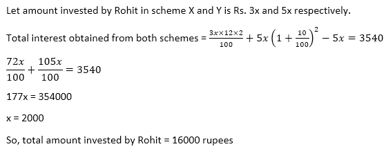 Q4. Rohit invested two amounts in the ratio of 3: 5 in two different schemes X and Y respectively. Scheme X provides simple interest at the rate of 12% p.a. while scheme Y provides compound interest at the rate of 10% p.a. After 2 years, he got a total interest of Rs. 3540. Find the total amount invested by Rohit in both schemes together.