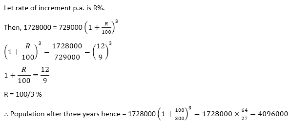 Q5. The population of a city, three years ago, was 7,29,000. The present population of the city is 17,28,000. What will be the population of the city three years hence? (Rate of increment of population is same for whole time period)