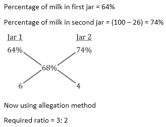Q9. Two Jar contains mixture of milk and water. First jar contains 64% milk and second jar contains 26% water. In what ratio these two mixtures are mixed so that new mixture contains 68% milk.
