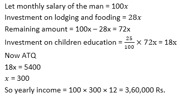 Q8. A man invests 28% of his monthly salary on lodging and fooding and 25% of remaining on children’s education and saves the remaining amount. If he spends Rs. 5400 each month on children’s education then find his yearly salary.