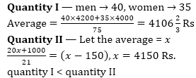 Q3. Quantity I — average income of the whole group of 75 people, if average income of the men in the group is Rs. 4200 and that of women is Rs. 4000. (total men: total women = 8 : 7)