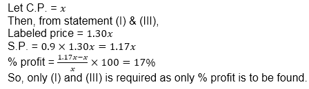 Quantity II — cost price of an article which is sold at 14% profit and if cost price and selling price both are Rs. 117 less, the profit would be 9% more.