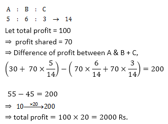 Q9. A, B and C enter into partnership with capital contribution with Rs. 25,000, 30,000 and 15,000 respectively. A is working partner and get 30% of profit for managing the business. The remaining profit is distributed in the respect of capital. At the end of a year A gets Rs. 200 more than that of B & C together then total profit is: