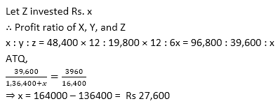 Q1. X and Y enter into a partnership by investing Rs. 48,400 and Rs. 19,800 respectively. After 6 months a third person Z also joined them with a certain amount. If total profit after an year was Rs. 16,400 and profit share of Y was 3960, then find investment of Z.