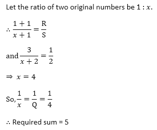 Q10. Two numbers are in the ratio 1 : Q. When 1 is added to both the numerator and the denominator, the ratio gets changed to R/S. Again, when 1 is added to both the numerator and the denominator, it becomes 1/2. Find the sum of 1 and Q.