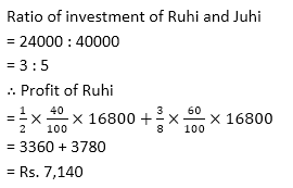 Q7. Ruhi and Juhi enter into a partnership with their initial investments of Rs. 24000 and Rs. 40,000 respectively. They decided to distribute 40% of profit equally between them and rest according to their investment ratio. If total profit after a year was Rs. 16,800 then find profit of Ruhi.