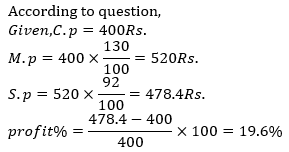 Q2. A retailer purchased radio sets at the rate of Rs. 400 each from a wholesaler. He marked up the price by 30% and allowed a discount of 8% on each set. Then find the profit percentage?