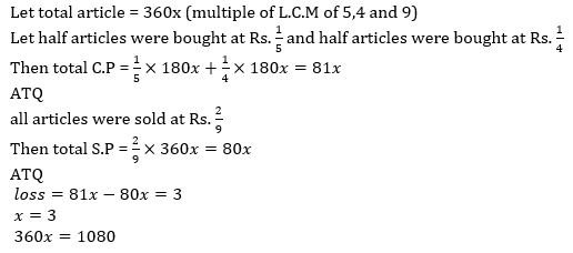 Q3. A person bought some articles at the rate of 5 per rupee and the same number at the rate of 4 per rupee. He mixed both the types and sold at the rate of 9 for 2 rupees. In this business he suffered a loss of Rs. 3. The total number of articles bought by him was